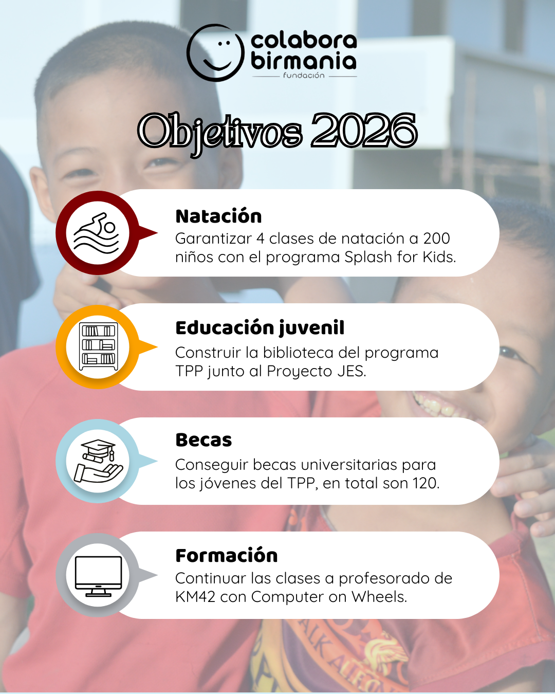 Además, apostamos por el desarrollo integral a través de programas complementarios. En 2026 queremos garantizar cuatro clases de natación a 200 niños con el programa Splash for Kids, una iniciativa vital en un entorno donde los riesgos acuáticos son elevados. También impulsamos la educación juvenil, con la construcción de la biblioteca del programa TPP, y trabajamos para conseguir 120 becas universitarias que permitan a jóvenes birmanos continuar sus estudios.